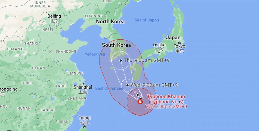 Po prečkanju Japonske se bo tajfun Khanun predvidoma pomaknil proti Vzhodnemu morju in se okoli srede zjutraj približal jugovzhodno od otoka Ulleung in otočkov Dokdo ter prizadel vzhodno obalno Koreje.