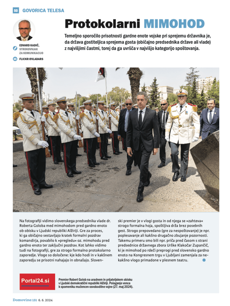 Na fotografiji vidimo slovenskega predsednika vlade dr. Roberta Goloba med mimohodom pred gardno enoto ob obisku v Ljudski republiki Alžiriji. Gre za proces, ki ga običajno sestavljajo kratek formalni pozdrav komandirja, povabilo k »pregledu« oz. mimohodu pred gardno enoto ter zaključni pozdrav. Kot lahko vidimo tudi na fotografiji, gre za strogo formalno protokolarno zaporedje. Vloge so določene: kje kdo hodi in v kakšnem zaporedju se prisotni nahajajo in obnašajo.