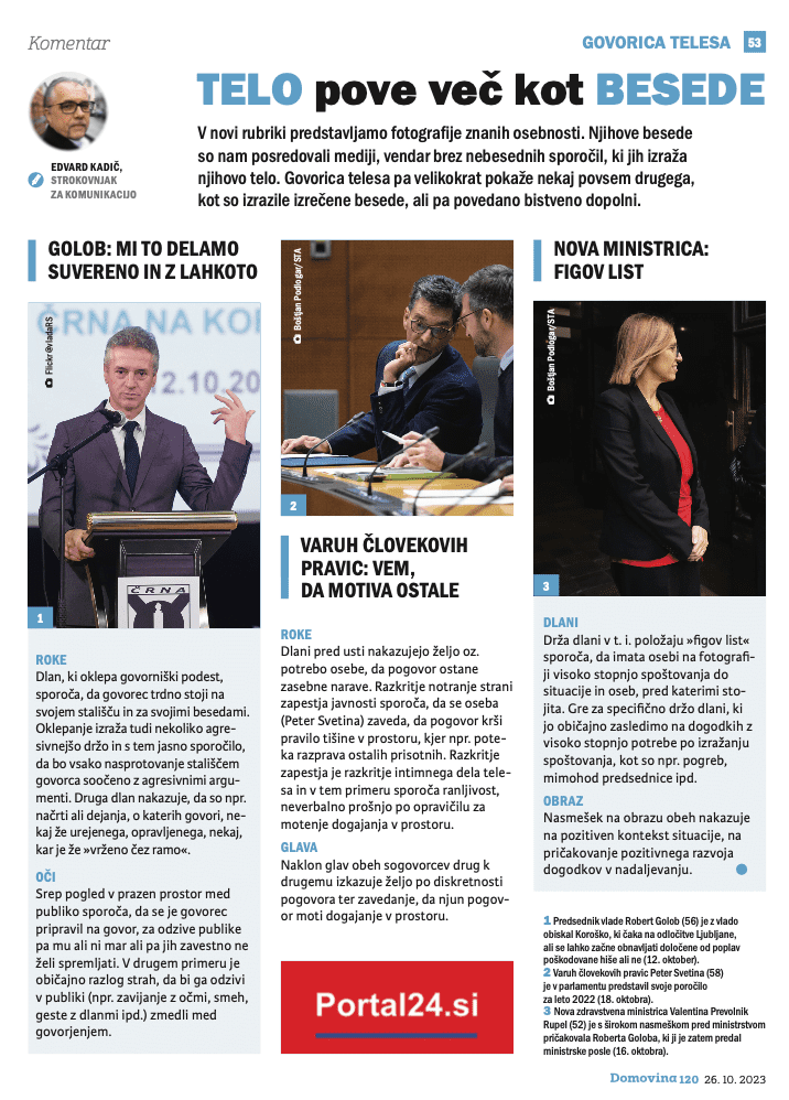 V rubriki o govorici telesa tednika Domovina (št. 120) so se pod drobnogledom razlage zakonitosti neverbalne komunikacije znašli predsednik vlade dr. Robert Golob, varuh človekovih pravic Peter Svetina in ministrica za zdravje dr. Valentina Prevolnik Rupel.