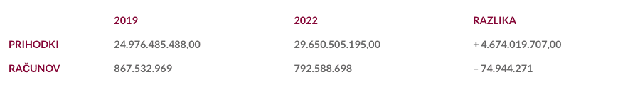 Iz prejetih podatkov je razvidno, da so bili prihodki po izdanih računih po davčnih blagajnah v letu 2022 v primerjavi z letom 2019 višji za 4,67 milijarde. Si predstavljate, za 4,67 milijarde evrov višji prihodki. Kako lahko potem govorimo o povečani sivi ekonomiji, če so prihodki višji za 4,67 milijarde evrov in če je leto 2022 boljše od leta 2019. Spodaj si lahko ogledate tabelo, v kateri so prikazani prihodki po davčnih blagajnah v letu 2019 in v letu 2022 ter število izdanih računov po davčnih blagajnah v letih 2019 in 2022. Zneski so v evrih.