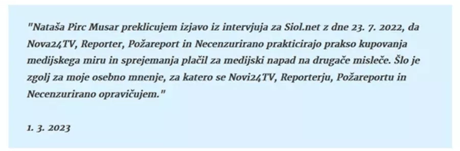 Požareport: Da ne bo pomote: Opravičilo Nataše Pirc Musar je prišlo šele po tem, ko smo ji časovno zagrozili s tožbo in plačilom odškodnine